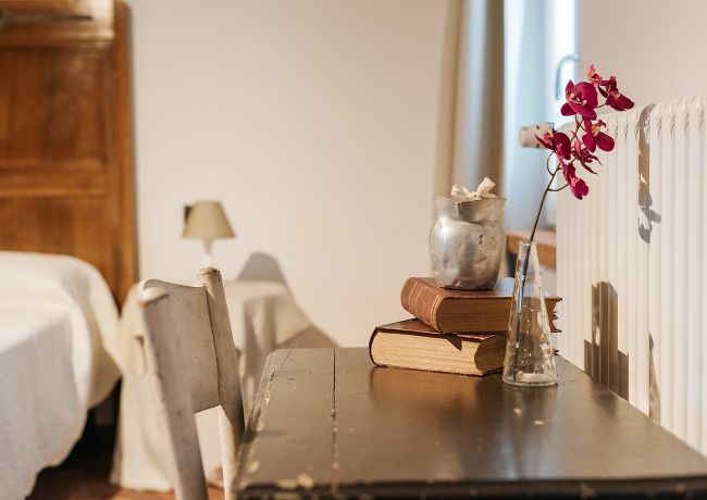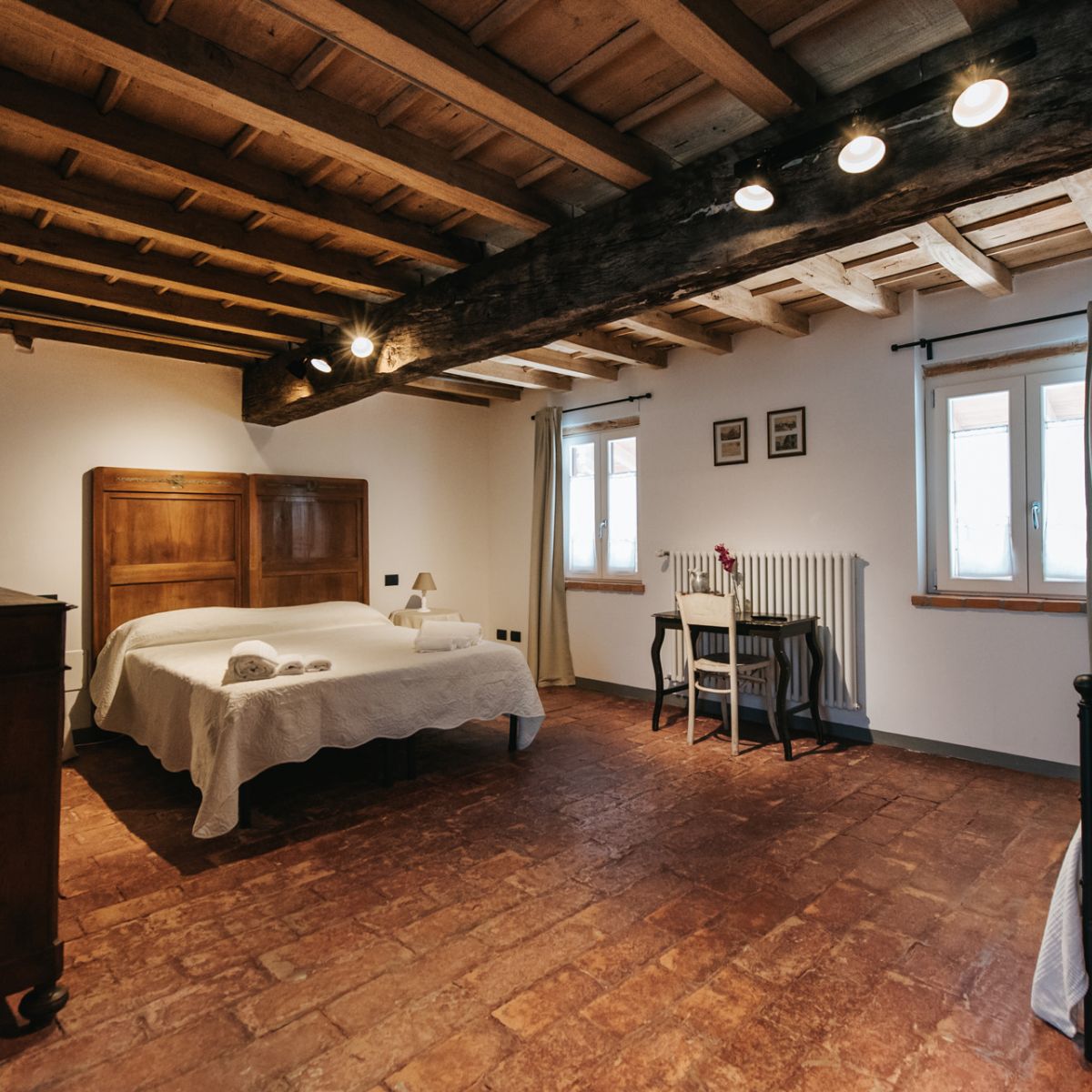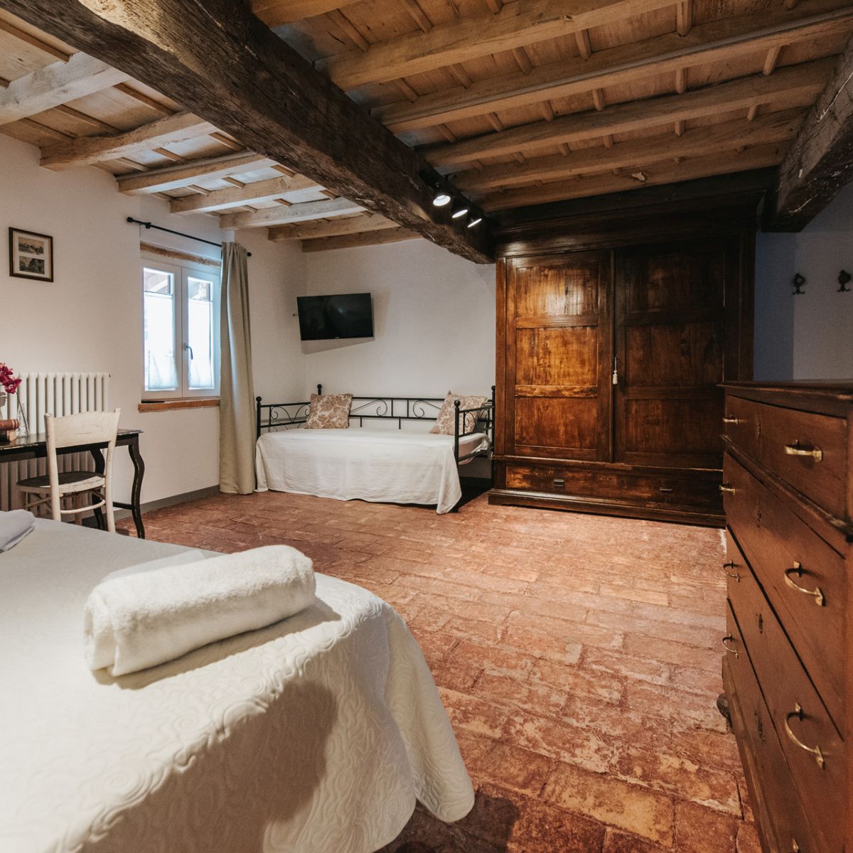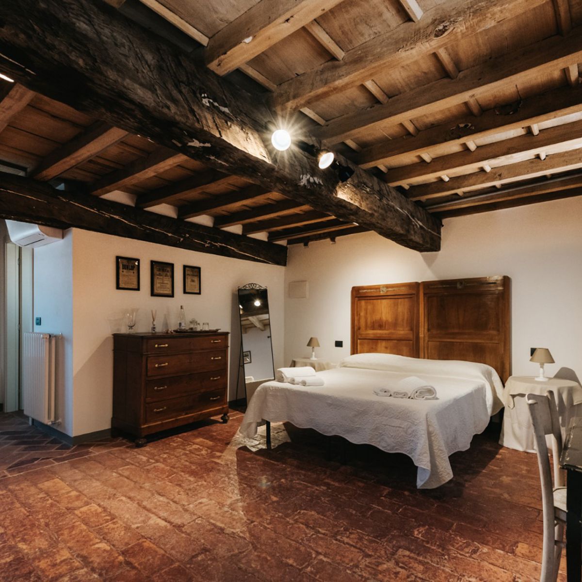 Arredata con gusto classico e reperti della nostra tradizione contadina. Bagno privato con doccia, phon e set cortesia, wi-fi, aria condizionata e frigobar.